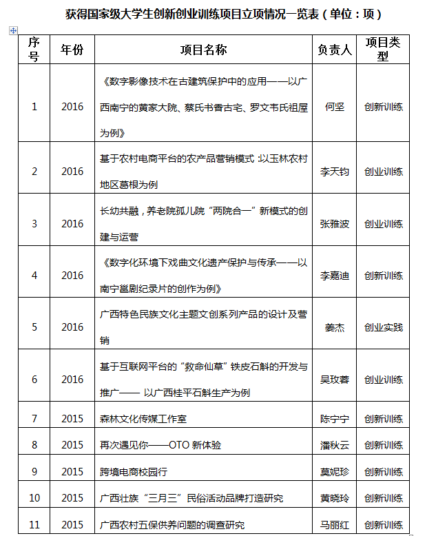 2015-2016年,共获得大学生创新创业训练项目立项69项,其中,国家级立项11项、自治区级立项18项,校级40项。