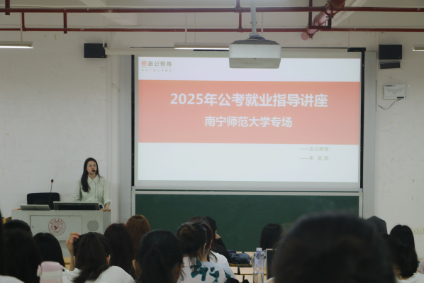 于3月26日下午在五合校区文理综合楼文楼举办了公职考试就业指导讲座。由志公教育南宁高校中心讲师朱凯莉主讲,吸引了众多学生参与,现场气氛热烈。
