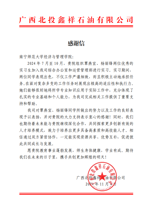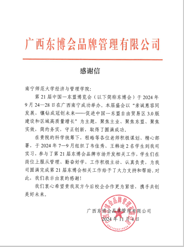 2024年11月,av影片 收到来自广西东博会品牌管理有限公司和广西北投鑫祥石油有限公司的两封感谢信,信中对学院今年7-10月派送的实习生在实习期间的表现予以高度赞扬,对学院的实习指导表示高度认可,对学院长期以来注重学生专业知识、综合素质培养等方面给予了充分肯定。感谢信具体内容如下: