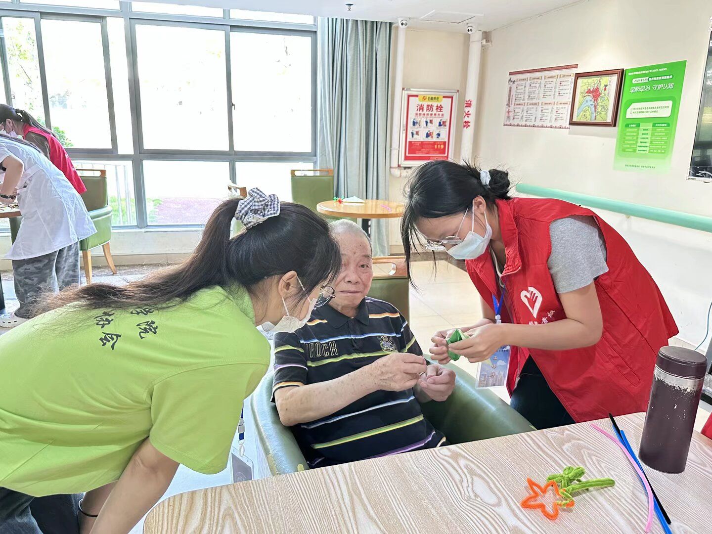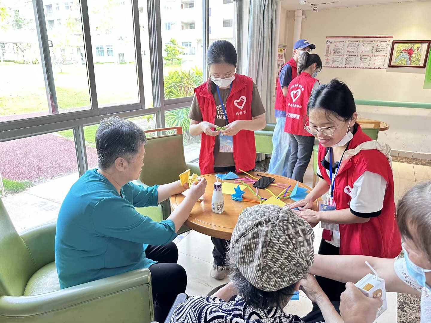 活动现场,志愿者们分成两组与老人们展开互动,精心开展了多项暖心服务。他们不仅通过合唱的方式活跃现场气氛,还与老人们亲切交谈,耐心倾听他们的生活故事,细致了解他们的生活需求和心愿。同时,志愿者们还开展了手工制作(扭扭棒花束、千纸鹤)、手机基础功能教学等服务,丰富了老人们的精神生活,提升了他们的生活便利程度。活动接近尾声时,志愿者们与老人们合影留念,清理完活动场地后有序告别,此次活动圆满结束。
