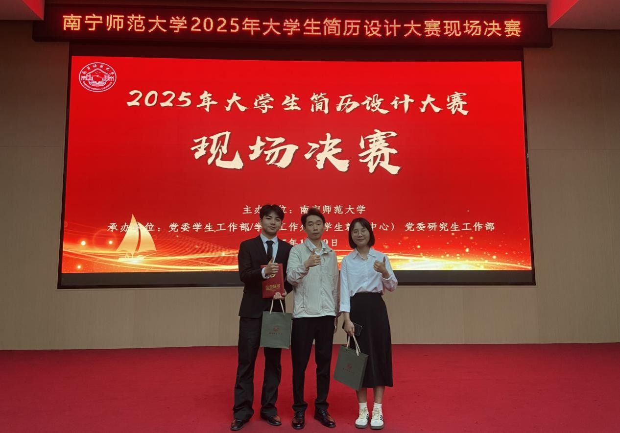 参加简历大赛决赛师生队伍(左:参赛选手龚崇伟,中:带队老师兰勇,右:参赛选手黄盟意)