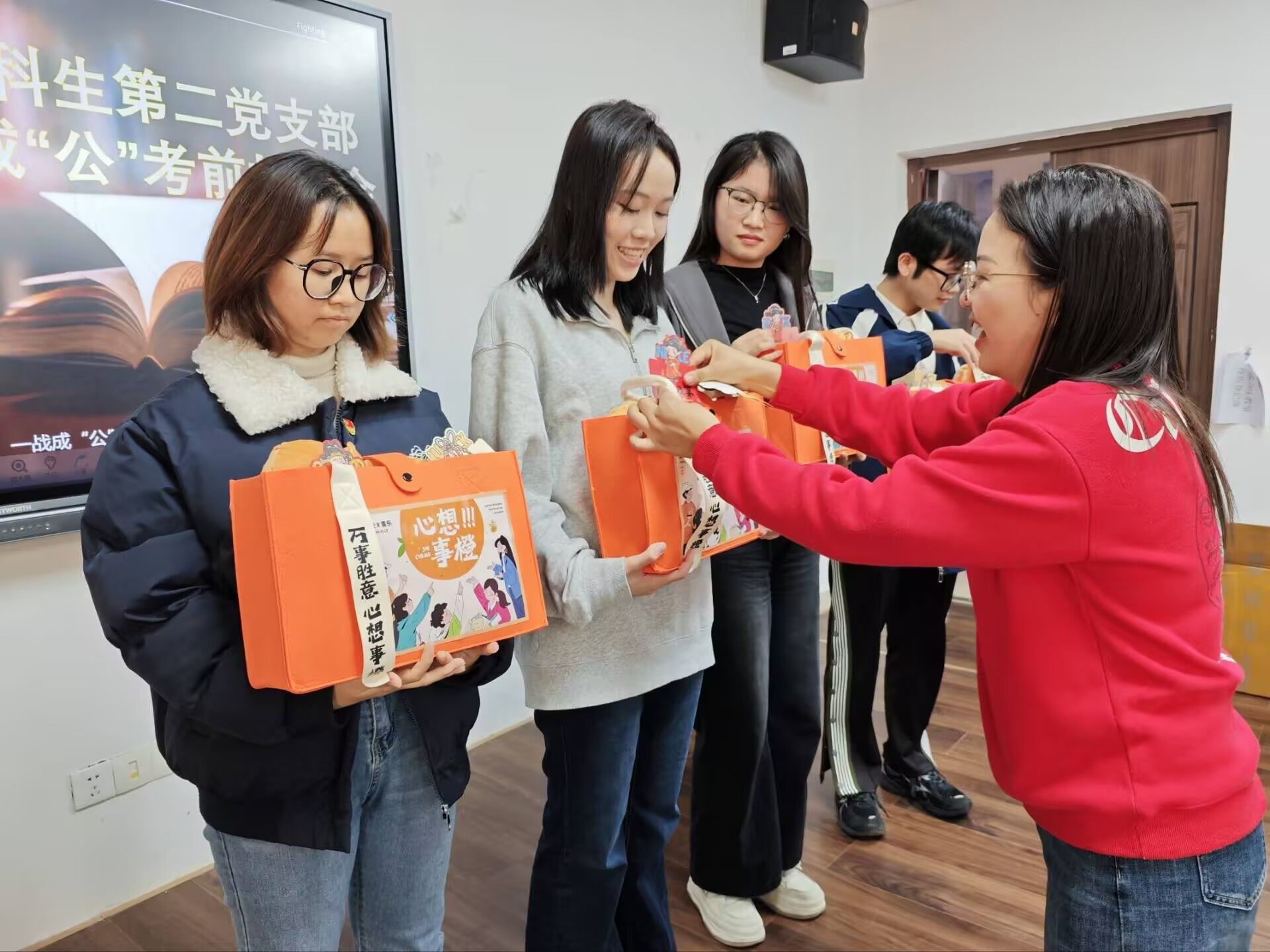 活动伊始,支部书记刘家瑶为备考学子寄语鼓劲,肯定大家的奋进姿态。她围绕心态调整、复习安排、劳逸结合等方面给出指导建议,勉励大家坚定信念、从容备考,祝愿考研考公学子金榜题名、一战成功。随后,全体党员提笔书写祝福贺卡,将支持与祝愿融入字里行间传递温暖。活动尾声,支部书记为考研考公学子代表送上“加油包”,全体党员同步递上手写贺卡,传递祝福。