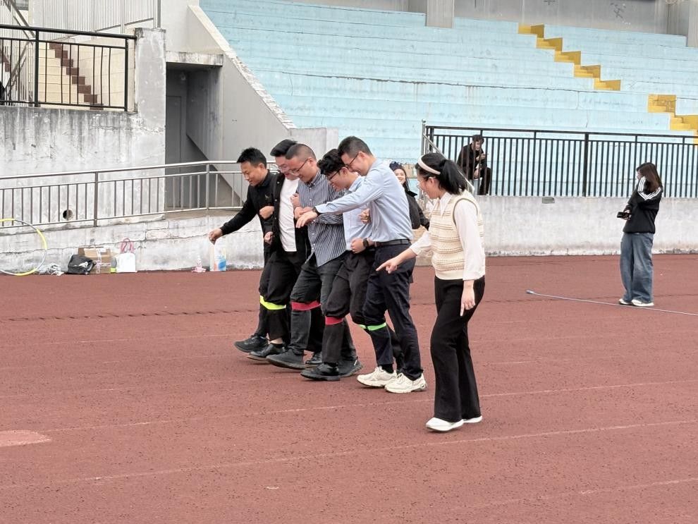 本次趣味运动会精心设置了“齐心协力运球”“穿越呼啦圈”与“五人六足”三项团队竞技项目,每项活动均注重考验与提升队员间的协作精神与默契。在“齐心协力运球”环节,队员们两两配合,以身体稳稳夹住气球,在观众阵阵助威声中谨慎而敏捷地向终点行进。“穿越呼啦圈”则更显巧思与联动,队员们手牵手连成一列,在不松开彼此的情况下,灵活而连贯地将呼啦圈依次传递,展现出流畅的团队配合。压轴项目五人六足将气氛推向高潮,队员们肩并肩、腿绑腿,在整齐划一的口号声中步伐一致地向前冲刺,生动诠释了同心协力的团队力量。