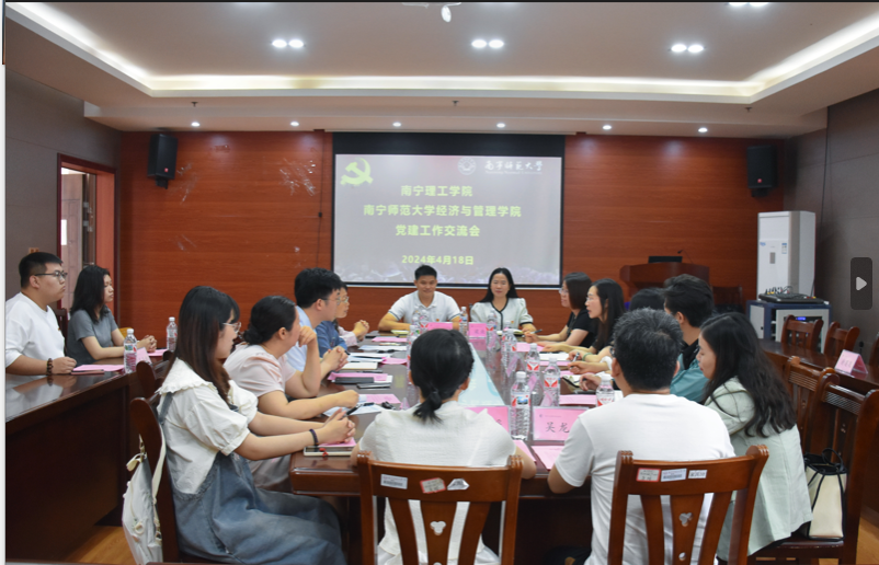 党委副书记何一飞主持会议,他对南宁理工学院的到来表示热烈欢迎。学院副院长、教工第一党支部书记何玲玲介绍了本支部获得首批新时代广西高校“双带头人”教师党支部书记工作室培育创建单位的工作经验,着重介绍了支部在“领航经管”项目上发挥的思政育人的辐射作用。本科生第二党支部书记刘家瑶介绍了本支部获得第四批“全国样板党支部”培育创建单位的工作经验,着重介绍了支部管理经验、党员教育模式、品牌活动建设等的育人成效。最后,何一飞副书记从党的创新理论学习、基层党组织建设等方面进行了总结。南宁理工学院商学院党总支书记姚顺良对av影片