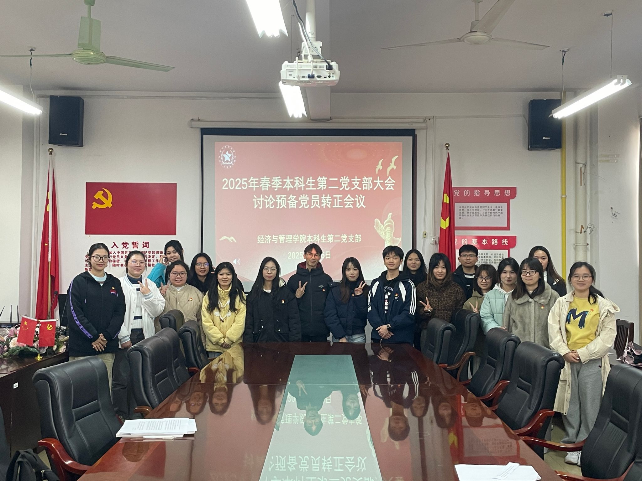 本科生第二党支部于明秀校区召开预备党员转正大会,讨论李莉琪、马管南两位同志的转正事宜,会议由支部副书记陆柳政主持。