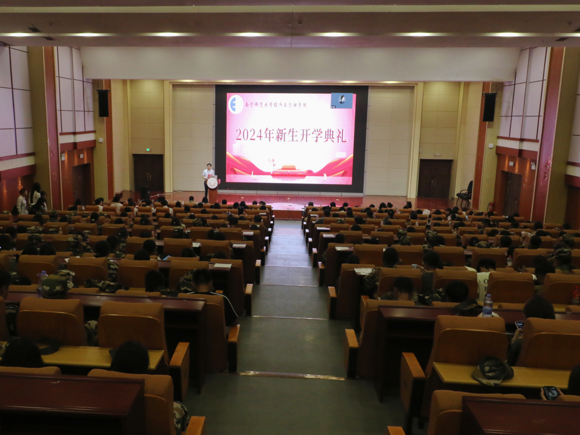 在文理综合楼文楼举行2024级新生开学典礼。学院党委书记韦海鸣教授、主持行政工作的副院长何玲玲教授、党委副书记何一飞、副院长丘兆逸教授以及系主任代表、新生班主任代表、年级辅导员等出席开学典礼,学院2024级全体新生参加开学典礼。开学典礼由学院党委副书记何一飞主持。