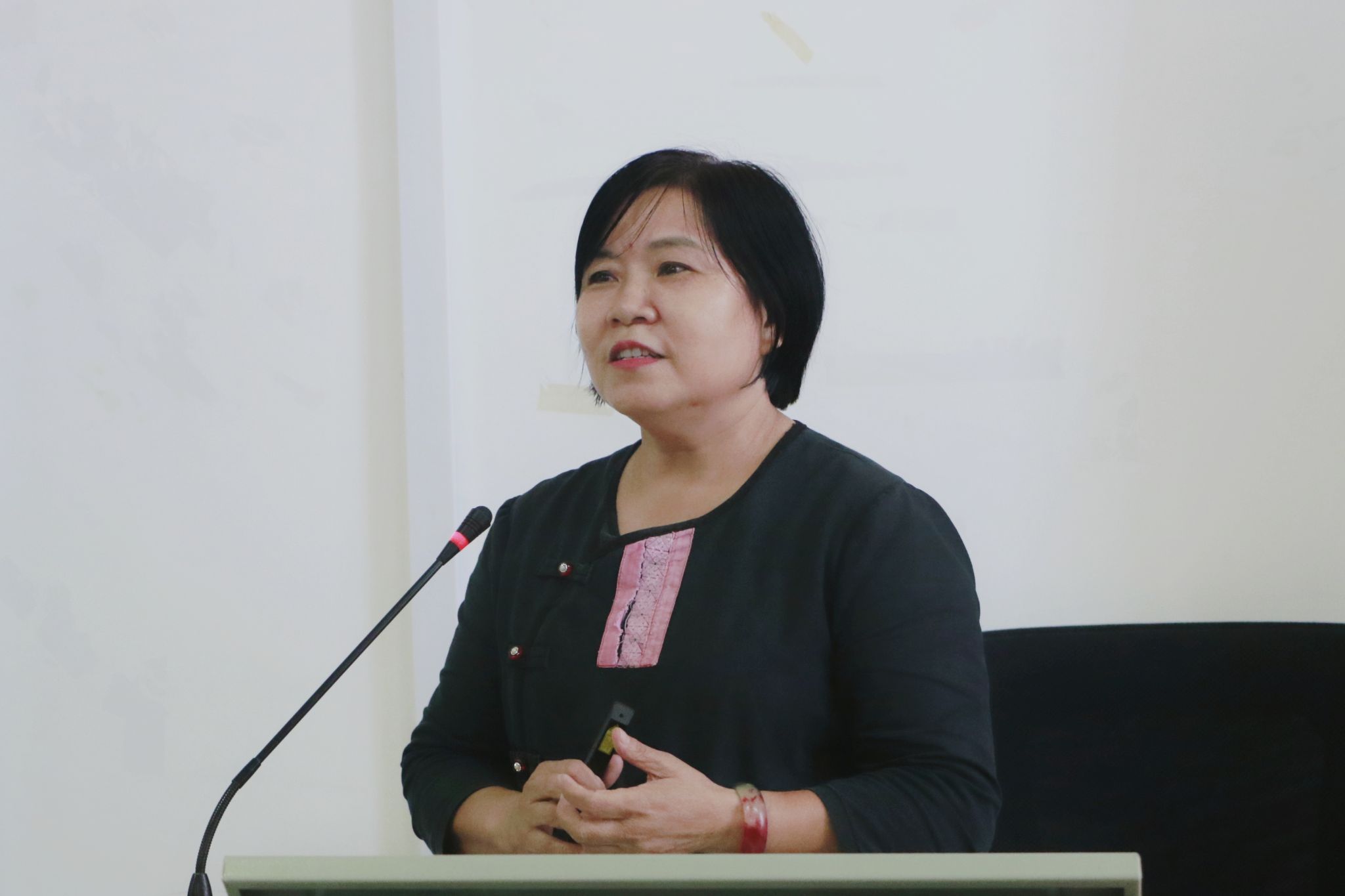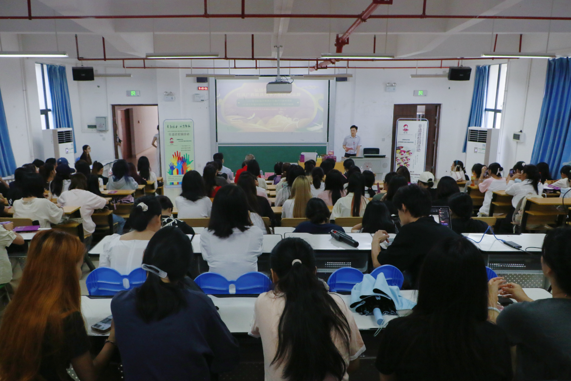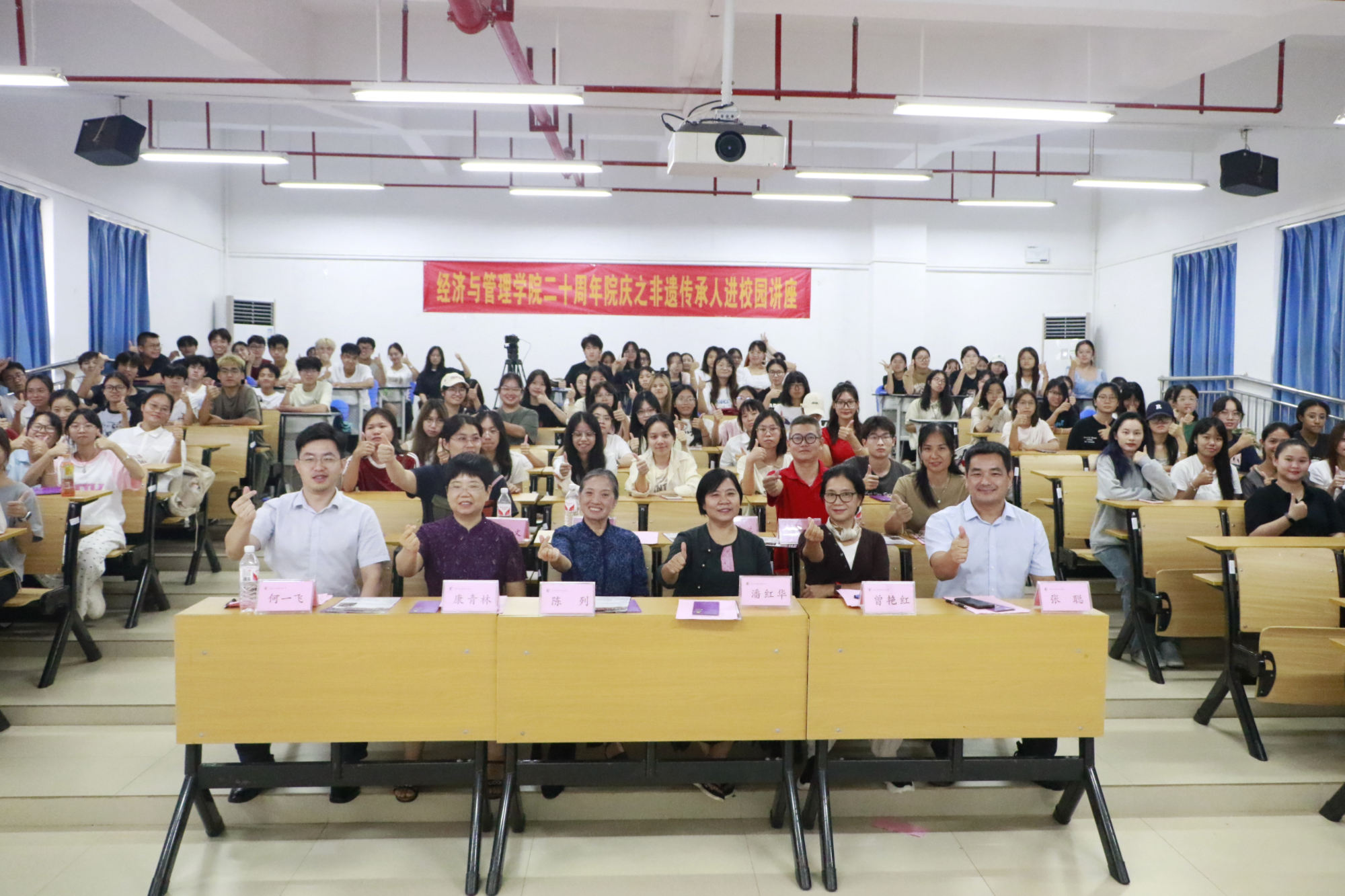 于文理综合楼文楼开展非遗传承人进校园讲座。广西壮乡民俗文化有限公司董事长潘红华作主讲人,学院副院长何玲玲、党委副书记何一飞、文化产业管理系主任张聪、文化产业管理系专任教师曾艳红、肖琳文、康青林、漆亚莉、陈列(退休)参加,文化产业管理专业全体学生参加。