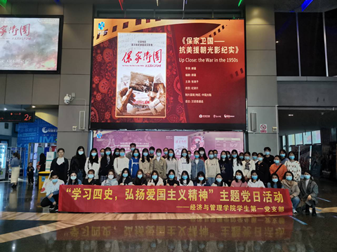学生第一党支部到南宁民族影城开展“学习四史,弘扬爱国主义精神”主题党日活动。集体观看了纪录片《保家卫国--抗美援朝光影纪实》。