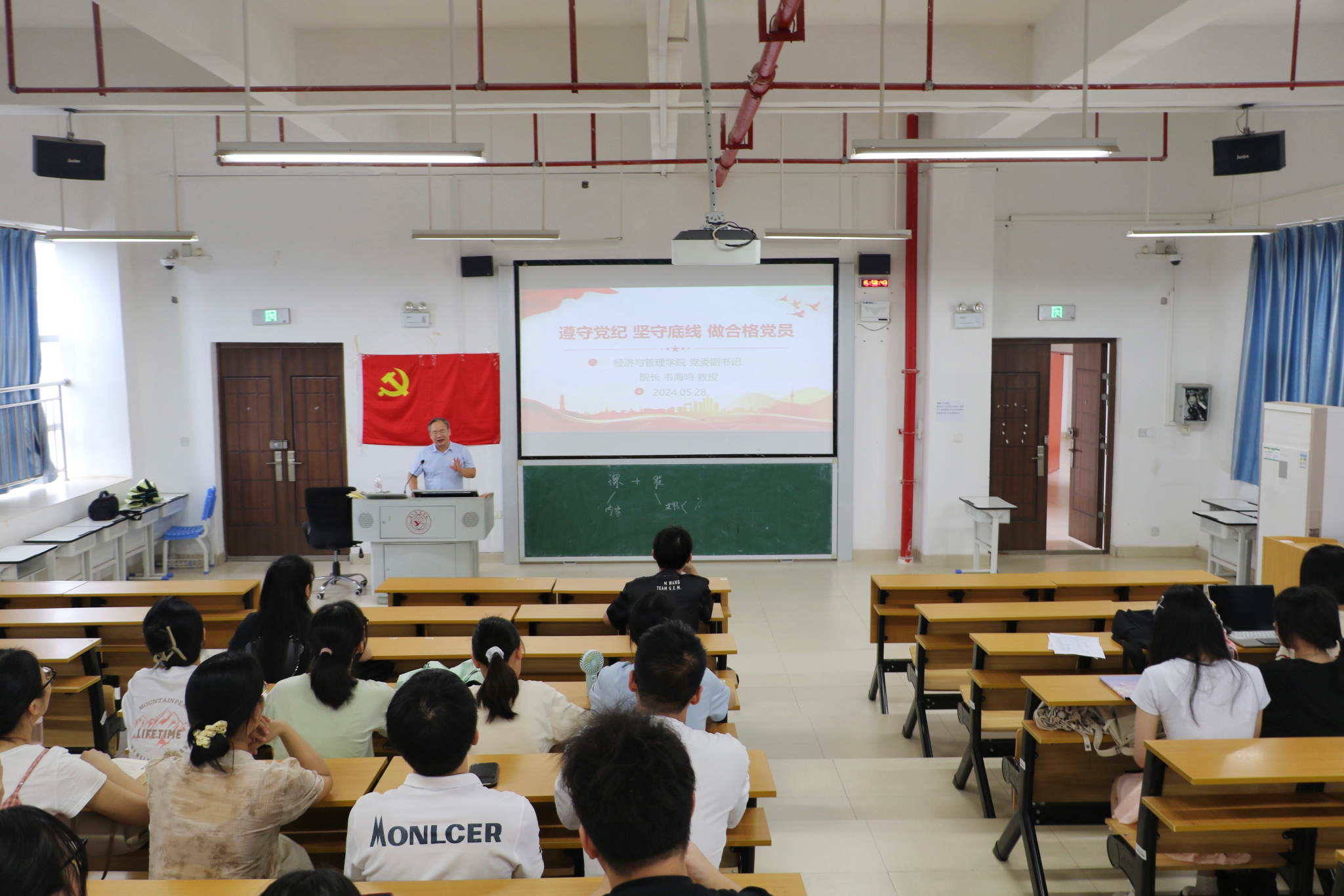 本次专题党课从四个方面进行,首先韦海鸣教授阐述了学习党纪的重要意义,重点介绍了新修订的纪律处分条例并强调了2024年党纪学习教育的重点,随后韦海鸣教授号召学生党员在思想上应强化的四种意识,即党的意识、群众意识、责任意识以及自律意识。最后,韦海鸣列举相关反面案例,深入讲解,呼吁学生党员提高道德修养,遵守党纪,坚守底线,做合格党员。
