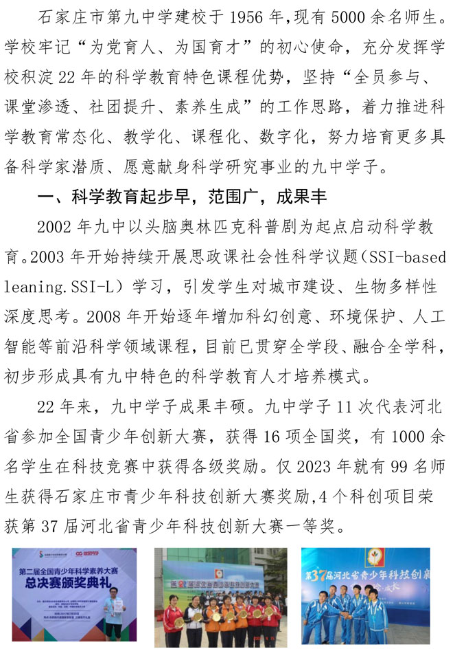 二十载深耕科学沃土 育英才谱写科教华章 石家庄市第九中学科学教育探索与实践