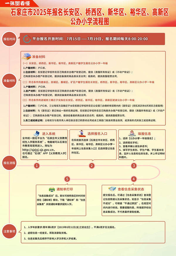 石家庄市2025年报名长安区、桥西区、新华区、裕华区、高新区公办小学流程图